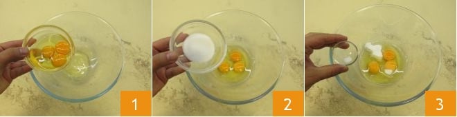 Um die Struffoli mit roten Früchten zuzubereiten, beginnen Sie mit der Vorbereitung des Teigs. Brechen Sie die Eier in eine große Schüssel 1, fügen Sie den Zucker 2 und eine Prise Salz hinzu 3.