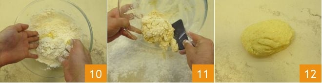 und beginnen Sie, es mit den Händen zu bearbeiten, weiterhin in der Schüssel 10. Sobald die Mischung ziemlich fest ist, übertragen Sie sie auf eine stark bemehlte Arbeitsfläche 11 und setzen die Bearbeitung fort, indem Sie mit den Händen in wenigen Bewegungen kneten, nur so lange, bis ein glattes und homogenes Ergebnis erzielt wird 12.