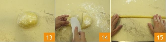 Wickeln Sie nun Ihren Teigklumpen in Frischhaltefolie 13 und stellen Sie ihn eine Stunde lang in den Kühlschrank. Nach der angegebenen Zeit nehmen Sie den Teigklumpen und bestäuben ihn mit weiterem Mehl, gerade so viel, wie nötig ist, um die Bearbeitung des Teigs zu erleichtern 14. Daraus ziehen Sie etwa 1 cm dicke Stränge, indem Sie jedes Teigstück verlängern 15 und es leicht auf der Arbeitsfläche schlagen, indem Sie es an den Enden nehmen, um den Teig elastischer zu machen und ihn leichter zu verlängern.