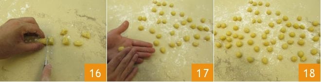 Verwenden Sie ein Messer, um aus jedem Strang etwa 0,5 cm breite Gnocchetti zu schneiden 16. Verwenden Sie dann die Handfläche, um die Teigstücke nacheinander zu rollen 17, um ihnen eine kugelförmige Form zu geben 18, die typisch für Struffoli ist.