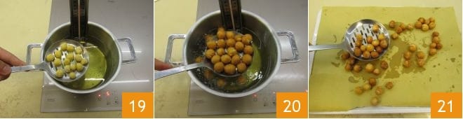 Jetzt können Sie sich um das Frittieren kümmern. Erhitzen Sie das Pflanzenöl in einem Topf, um eine Temperatur von 170° zu erreichen, und nur wenn es heiß ist, lassen Sie die Teigstücke mit einem Schaumlöffel in das heiße Öl gleiten 19. Um die Temperatur des Öls nicht zu stark zu senken, empfehlen wir, nur wenige Stücke gleichzeitig zu frittieren. Wenden Sie Ihre Struffoli von Zeit zu Zeit mit einem Schaumlöffel und sobald sie goldbraun sind, nehmen Sie sie aus dem Öl (es dauert etwa 5 Minuten) 20 und legen Sie sie auf ein mit Küchenpapier ausgelegtes Tablett 21.