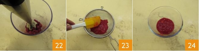 Sobald die Struffoli frittiert sind, beginnen Sie mit der Zubereitung der Glasur. Zuerst pürieren Sie die Himbeeren mit einem Stabmixer 22; dann passieren Sie das Fruchtfleisch 23, um ein glattes Püree zu erhalten 24.