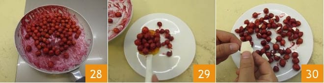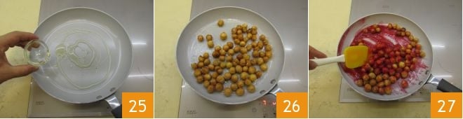 Gießen Sie den Honig in eine heiße, aber nicht brennende Pfanne 25, fügen Sie die Struffoli hinzu und mischen Sie mit einem Spatel, bis sie vollständig glasiert sind 26. Fügen Sie das gerade gesiebte Himbeerpüree hinzu und mischen Sie, um die Struffoli gleichmäßig zu bedecken 27.