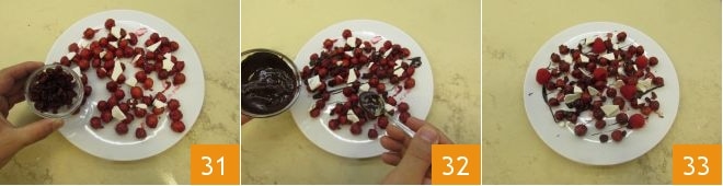 Fügen Sie getrocknete Himbeeren hinzu 31, und vervollständigen Sie die Platte mit etwas geschmolzener Schokolade 32, frischen Himbeeren und servieren Sie Ihre Struffoli mit roten Früchten 33!