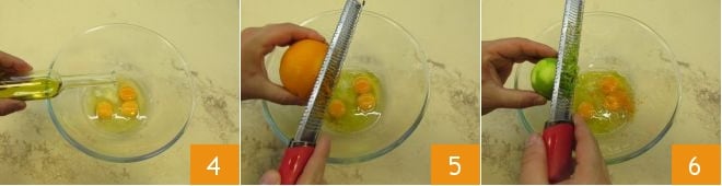 Fügen Sie auch einen Schuss Öl hinzu 4, abgeriebene Orangenschale (etwa 1/4 wird benötigt) 5 und abgeriebene Limettenschale 6.