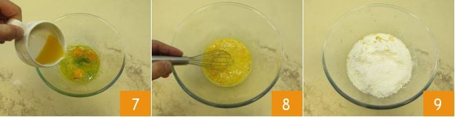 Fügen Sie dann auch den Saft der Orange hinzu 7 und beginnen Sie, die Mischung mit einem Schneebesen zu verrühren 8. Geben Sie das Mehl auf einmal in die Mischung 9