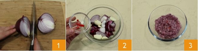 Um den würzigen Hähnchen-Erdnuss-Eintopf zuzubereiten, die rote Zwiebel schälen und in Stücke schneiden 1; in eine kleine Schüssel mit dem Knoblauch und dem Chili geben 2. Alles mit einem Mixer oder einem Stabmixer zerkleinern 3 und beiseite stellen.
