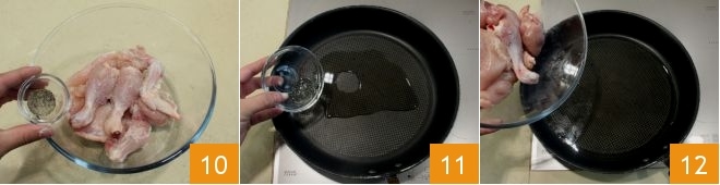 und Pfeffer 10; das Fleisch mit den Händen einmassieren, damit es den Geschmack aufnimmt. Erdnussöl in einem großen Antihaft-Topf erhitzen 11 und das Hähnchen in Stücken hinzufügen 12 und es anbraten.