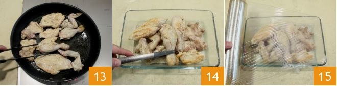 von beiden Seiten anbraten 13 und etwa 4-5 Minuten pro Seite kochen; dann das Hähnchen herausnehmen und warm beiseite stellen 14, mit Frischhaltefolie abgedeckt 15.