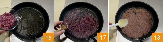 In derselben Pfanne, in der das Hähnchen angebraten wurde, die Zwiebel-Knoblauch-Mischung hineingeben 16, gemahlenen Kreuzkümmel hinzufügen 17 und umrühren 18, und die Mischung für einige Momente andünsten.