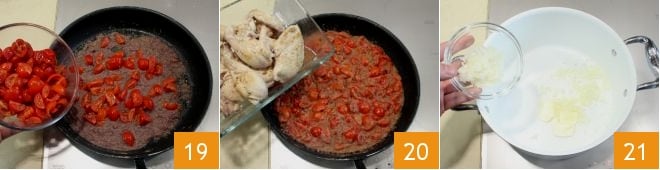 Dann die Tomaten hinzufügen 19 und etwa 10 Minuten kochen lassen, bis die Tomaten ihren Saft abgeben und leicht zerfallen. Jetzt auch die Hähnchenteile hinzufügen 20, würzen und dann mit heißem Wasser oder Hühnerbrühe bedecken und mit einem Deckel abdecken: mindestens 40 Minuten bei sehr niedriger Hitze kochen lassen und gelegentlich den Kochvorgang kontrollieren, damit die Flüssigkeit nicht zu stark verdunstet. In der Zwischenzeit den Reis Pilaw zubereiten: die Zwiebel fein hacken und in einem großen Topf die Butter schmelzen lassen, die gehackte Zwiebel zur geschmolzenen Butter geben 21 und bei niedriger Hitze etwa 15 Minuten andünsten, bis sie durchsichtig wird: darauf achten, dass sie nicht Farbe annimmt.