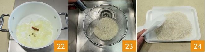 Zimt und Nelken hinzufügen 22 und für weitere zwei Minuten umrühren. In der Zwischenzeit den Reis unter fließendem Wasser abspülen, abtropfen lassen und vollständig auf einem Tablett mit Küchenpapier ausgelegt trocknen lassen 24.