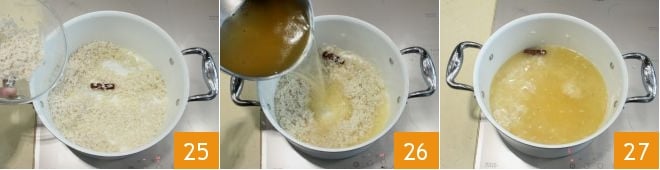 Den Reis in den Topf geben 25 und einige Momente unter Rühren mit einem Holzspatel rösten lassen. Dann die gesamte Brühe hinzufügen, (26-27). Den Topf mit einem Deckel abdecken (es sollte kein Dampf entweichen) und bei mäßiger Hitze mindestens 18-20 Minuten kochen lassen, bis die Brühe vollständig aufgenommen ist. Sobald der Reis gekocht und gut getrocknet ist, den Reis Pilaw vom Herd nehmen, mit einer Gabel gut auflockern und beiseite stellen.