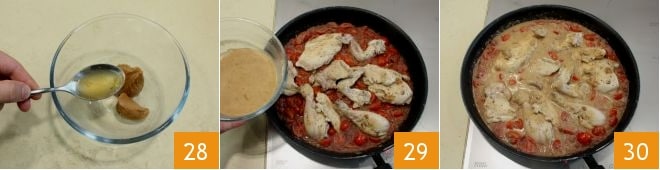 In einer kleinen Schüssel die Erdnussbutter mit 2-3 Esslöffeln der Hähnchenkochflüssigkeit 28 verdünnen und 10 Minuten vor Ende der Kochzeit zum Topf geben 29. Nach dem Kochen 30 den würzigen Hähnchen-Erdnuss-Eintopf heiß mit Reis Pilaw servieren!