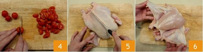 Auch die Tomaten waschen und vierteln 4, dann das Hähnchen vorbereiten: die Haut entfernen, indem man sie mit einem sehr scharfen Messer einschneidet 5; nachdem die gesamte Haut entfernt ist 6, auch die Fettteile entfernen, die vorhanden sein können
