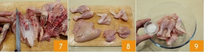 und dann das Hähnchen in Stücke schneiden (7-8), dabei sorgfältig auch die kleinen Knochen entfernen. Das Hähnchen in eine Schüssel legen, Salz hinzufügen 9