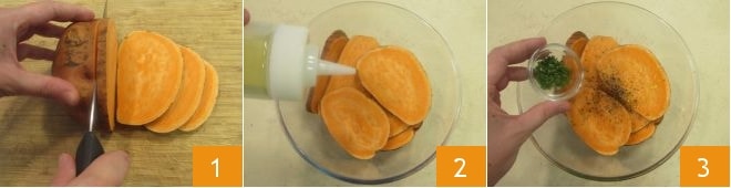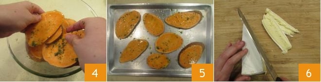 Massieren Sie die Süßkartoffeln, um sie zu würzen 4, legen Sie sie dann auf ein Backblech 5 und backen Sie sie in einem vorgeheizten Umluftofen bei 200° etwa 20-25 Minuten. Während die Kartoffeln backen, schneiden Sie den Brie in dicke Scheiben, wobei Sie versuchen, Scheiben in der gleichen Größe wie die Kartoffeln zu erhalten 6.