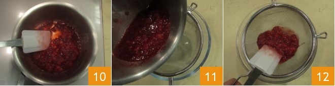 Kochen Sie bei schwacher Hitze für 2-3 Minuten, gerade genug, um ein Püree zu erhalten 10. Passieren Sie es durch ein Sieb (11-12) und sammeln Sie die erhaltene Soße in einer Schüssel.