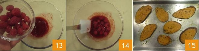 Lassen Sie sie abkühlen, bevor Sie die restlichen Himbeeren hineingeben 13 und rühren Sie vorsichtig um 14. Inzwischen sind die Kartoffeln fertig, also nehmen Sie sie aus dem Ofen 15,