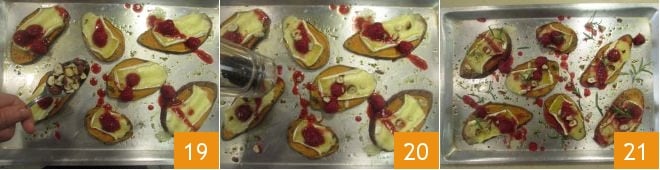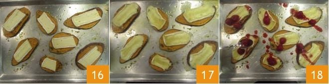 legen Sie eine Scheibe Brie auf jede 16 und stellen Sie sie bei 240° für 4-5 Minuten in der Grillfunktion zurück in den Ofen, um den Käse zu schmelzen. Nach dieser Zeit nehmen Sie die Bruschetta heraus 17, fügen Sie die Soße mit den ganzen Himbeeren hinzu 18,