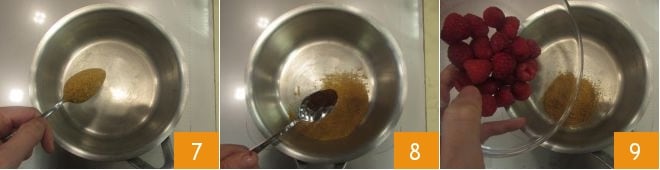 Kümmern Sie sich nun um die Soße: Geben Sie in einem kleinen Topf den braunen Zucker 7, das Chilipulver 8 und die Hälfte der Himbeeren 9.