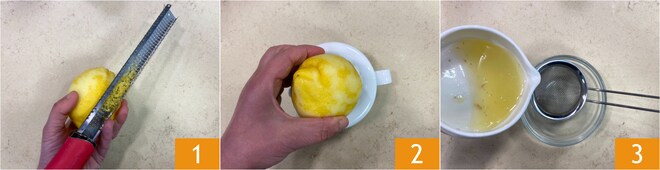 Für den superschnellen Zitronenkuchen reiben Sie die Zitronenschale ab 1 und stellen Sie sie beiseite. Pressen Sie die Zitrone aus 2 und filtern Sie den Saft 3.