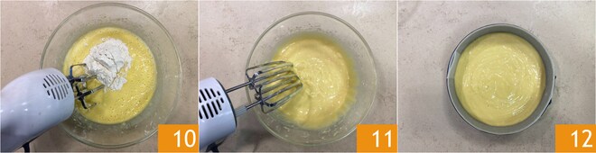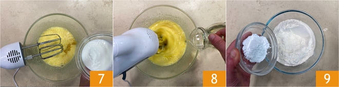 Den Joghurt 7 und das Öl in einem dünnen Strahl 8 zusammen mit dem Zitronensaft zugeben. Nun das Mehl mit dem Backpulver, gesiebt, und eine Prise Salz mischen 9.