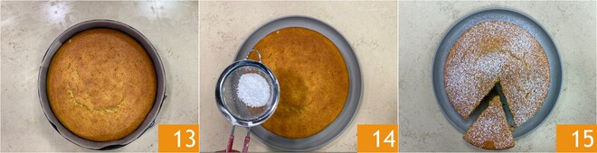 Im vorgeheizten Ofen bei 170°C für 50 Minuten backen. Den Kuchen aus dem Ofen nehmen und abkühlen lassen 13, dann nach Belieben mit Puderzucker bestreuen 14. Der superschnelle Zitronenkuchen ist bereit, genossen zu werden 15.