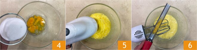 In einer Schüssel die Eier und den Zucker 4 geben. Mit einem elektrischen Handrührer arbeiten, bis eine helle und schaumige Masse entsteht 5. Geben Sie die Zitronenschale dazu 6.
