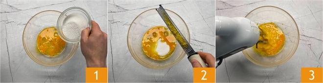 Um den superweichen Ricottakuchen zuzubereiten, beginnen Sie damit, die Eier in eine Schüssel zu schlagen, fügen dann den Zucker 1 und die abgeriebene Zitronenschale 2 hinzu. Schalten Sie die Rührgeräte für etwa zehn Minuten ein 3.