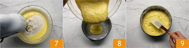 Wenn die Mischung ihr Volumen verdoppelt hat, fügen Sie die Ricotta löffelweise hinzu 4, reduzieren Sie dann die Geschwindigkeit ein wenig und geben Sie das Öl in einem dünnen Strahl hinzu 5. Schalten Sie die Rührgeräte aus und sieben Sie das Mehl und das Backpulver in die Schüssel 6.