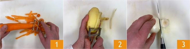 Um die Pastina in Brühe zuzubereiten, beginnen Sie mit dem Putzen der Karotte 1, der Kartoffel 2, der Zwiebel 3 und des Selleries.