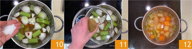 Salzen Sie nach Geschmack 10, dann stellen Sie die Herdplatte auf mittlere Hitze, decken mit einem Deckel ab 11 und lassen Sie es etwa 30 Minuten sanft köcheln, bis das Gemüse weich ist 12.