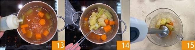 Nach Ablauf der Kochzeit fügen Sie einen Schuss Öl hinzu 13, dann nehmen Sie das Gemüse heraus 14 und geben es in ein hohes Gefäß. Pürieren Sie es mit einem Stabmixer 15.