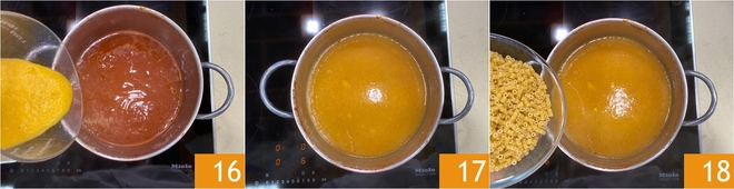 Gießen Sie die Gemüsecreme erneut in die Brühe 16 und erhitzen Sie sie, bis sie wieder kocht. Dann fügen Sie die Pastina hinzu 18.