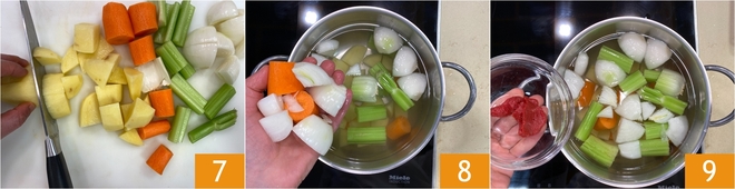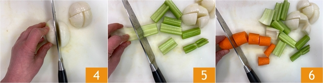 Spülen Sie das Gemüse unter fließendem Wasser ab und schneiden Sie Zwiebel 4, Sellerie 5 und Karotte 6 grob.