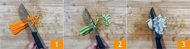 Um die Supplì aus Nudeln und Kartoffeln zuzubereiten, machen Sie als erstes die Gemüsebrühe und halten Sie sie warm. Beginnen Sie mit dem Gemüse für das Soffritto: Schälen und würfeln Sie die Karotten 1, den Sellerie 2 und die Zwiebel 3 in 1 cm große Stücke.