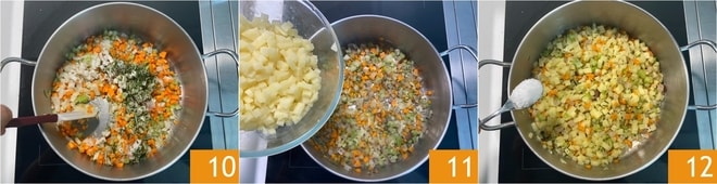 Braten Sie es bei mittlerer bis hoher Hitze 5 Minuten unter häufigem Rühren an 10. Fügen Sie nun die Kartoffeln hinzu 11 und salzen Sie 12.