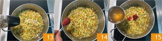 Würzen Sie mit schwarzem Pfeffer 13 und Tomatenmark 14, dann bedecken Sie alles mit einem Teil der Gemüsebrühe 15.