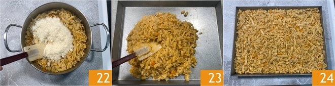 Rühren Sie gut um 22, dann geben Sie die Pasta und Kartoffeln auf ein Backblech 24, indem Sie sie über die gesamte Oberfläche verteilen 24. Legen Sie das Blech in den Kühlschrank.