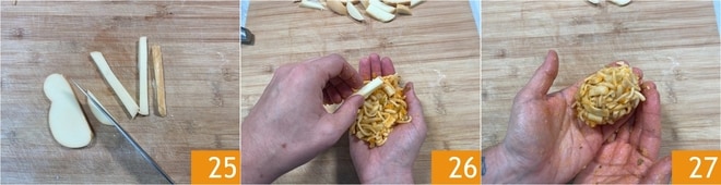 In der Zwischenzeit schneiden Sie die Scamorza in Streifen 25. Nach der Kühlzeit befeuchten Sie Ihre Hände und nehmen Sie eine Portion Pasta und Kartoffeln, drücken Sie sie leicht in Ihrer Handfläche, fügen Sie dann die Scamorza hinzu 26 und schließen Sie sie innen ab, um Supplì zu formen 27; mit diesen Mengen sollten Sie etwa 20 erhalten.
