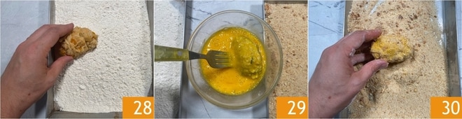 Nachdem Sie alle Supplì geformt haben, sind Sie bereit für die Panade: Wälzen Sie die Supplì zuerst in Mehl 28, dann in den geschlagenen Eiern 29 und schließlich in der Mischung aus feinem und rustikalem Paniermehl 30.