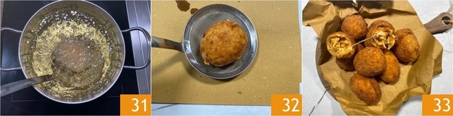Erhitzen Sie das Pflanzenöl auf 160° und frittieren Sie 1-2 Supplì gleichzeitig für etwa 4 Minuten 31. Wenn sie schön goldbraun sind, lassen Sie sie auf frittiertem Papier abtropfen 32. Ihre Supplì aus Nudeln und Kartoffeln sind fertig, servieren Sie sie noch heiß 33!