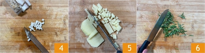 Würfeln Sie auch den Speck 4. Schälen Sie die Kartoffeln und schneiden Sie sie ebenfalls in gleich große Würfel 5. Hacken Sie schließlich den Rosmarin fein 6.