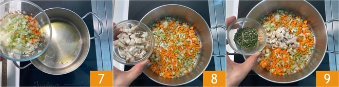 Erhitzen Sie das Öl in einem großen Topf, dann fügen Sie das gehackte Gemüse 7, den Speck 8 und den Rosmarin 9 hinzu.