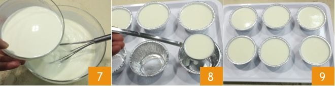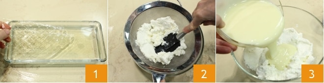 Um die süße Milch zuzubereiten, beginnen Sie damit, die Gelatine etwa 10 Minuten in kaltem Wasser einzuweichen, um sie zu erweichen 1. Sieben Sie den Ricotta in eine große Schüssel, um Klumpen im Teig zu vermeiden 2, und fügen Sie die Kondensmilch hinzu 3.