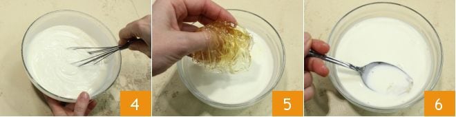 Vermischen Sie die Masse gut mit einem Schneebesen 4. Drücken Sie die zuvor eingeweichte Gelatine gut aus und lösen Sie sie in der lauwarmen Sahne auf 5, rühren Sie mit einem Löffel, bis sie vollständig aufgelöst ist 6.