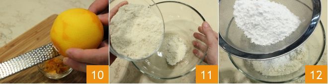 In der Zwischenzeit kümmern Sie sich um den Keks, der die süße Milch begleiten wird: Reiben Sie die Schale einer Orange 10 und bewahren Sie sie auf. In einer Schüssel geben Sie die gehackten Mandeln 11, fügen Sie den gesiebten Puderzucker hinzu 12,
