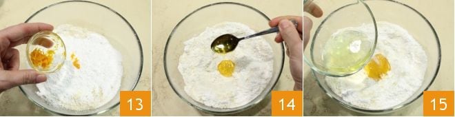 aromatisieren Sie mit der geriebenen Orangenschale 13 und einem Teelöffel Honig 14, zuletzt fügen Sie ein Eiweiß 15 und eine Prise Salz hinzu.