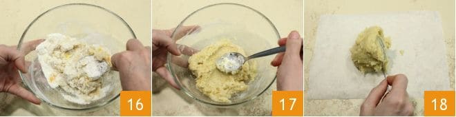 Nun mischen Sie die Masse mit einem Löffel 16, bis Sie einen kompakten und gut vermischten Teig erhalten 17. Legen Sie ein Blatt Backpapier auf eine Arbeitsfläche, geben Sie den Teig mit einem Löffel darauf 18